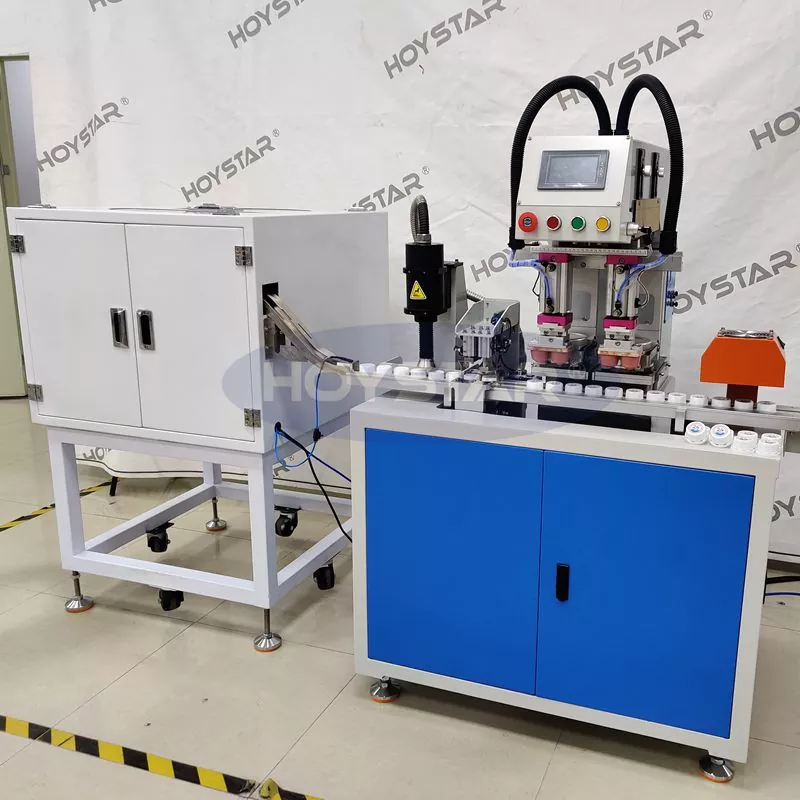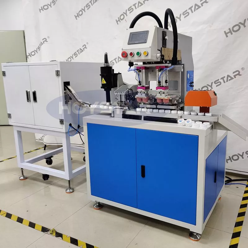 เครื่องพิมพ์แผ่นฝาขวด 2 สีพร้อมการบำบัดด้วยพลาสม่าพร้อมกับเครื่องป้อนแบบสั่นอัตโนมัติสามารถรับรู้การโหลดอัตโนมัติโดยไม่ต้องดำเนินการด้วยตนเอง ซึ่งช่วยประหยัดกำลังคน