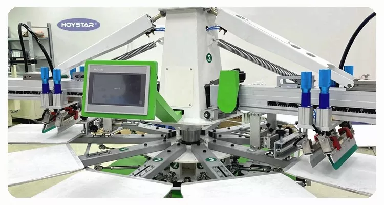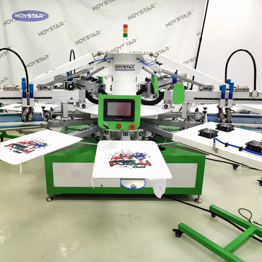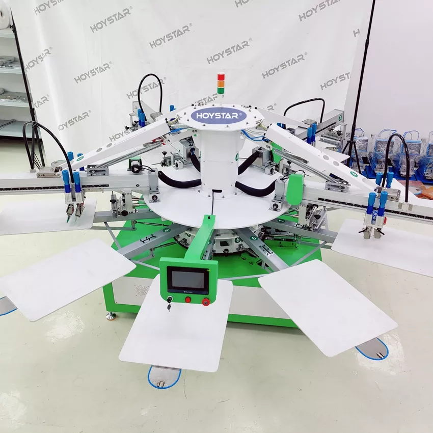 เครื่องพิมพ์หน้าจอการพิมพ์สิ่งทอเสื้อยืด HOYSTAR 4 สีนี้ได้รับการออกแบบมาโดยเฉพาะสำหรับอุตสาหกรรมการพิมพ์ มาพร้อมกับไมโครโปรเซสเซอร์อัจฉริยะ หน้าจอสัมผัส และระบบขับเคลื่อนด้วยมอเตอร์ ช่วยให้มั่นใจได้ถึงความเสถียรในการพิมพ์สูงและความทนทานต่อการลงทะเบียนสีภายใน ±0.1 มม. ซึ่งช่วยเพิ่มความแม่นยำและความสม่ำเสมอในการพิมพ์อย่างมาก เหมาะสำหรับงานพิมพ์ต่างๆ เช่น เสื้อยืด เสื้อผ้า ป้าย และผ้า เครื่องพิมพ์สกรีนอัตโนมัตินี้เป็นโซลูชั่นที่ดีเยี่ยมสำหรับการผลิตงานพิมพ์ที่มีความแม่นยำสูงและมีประสิทธิภาพ