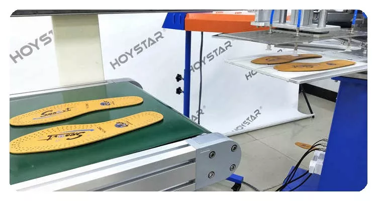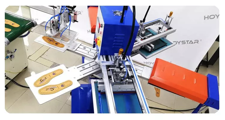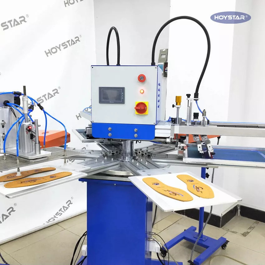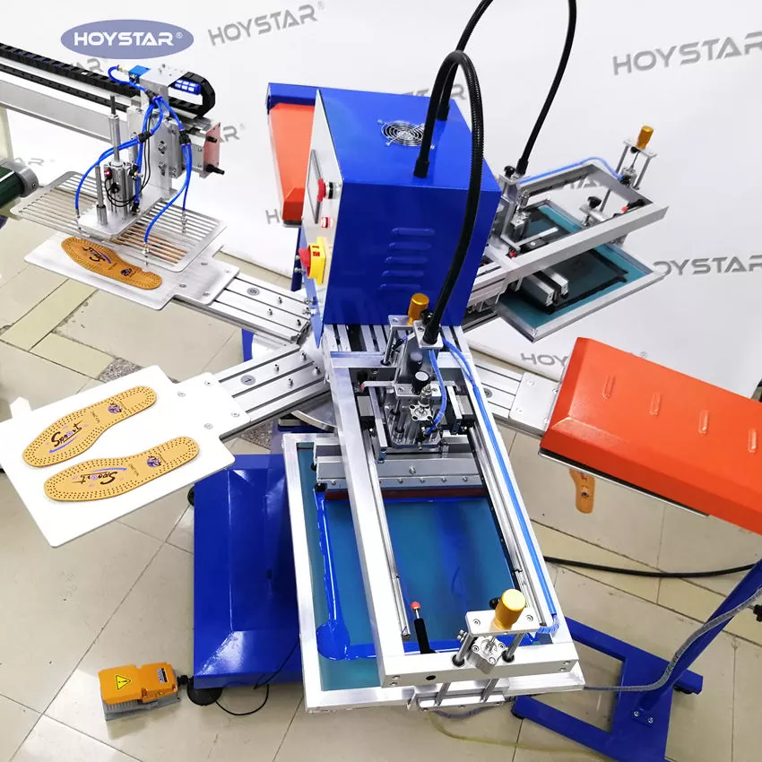 เครื่องพิมพ์สกรีน 2 สีอัตโนมัติสำหรับพื้นรองเท้าพร้อมเวิร์กสเตชัน 6 ชิ้นและระบบอบแห้ง 2 ชิ้น