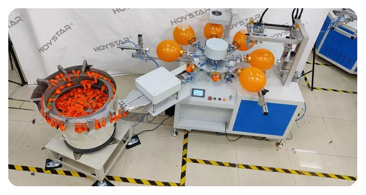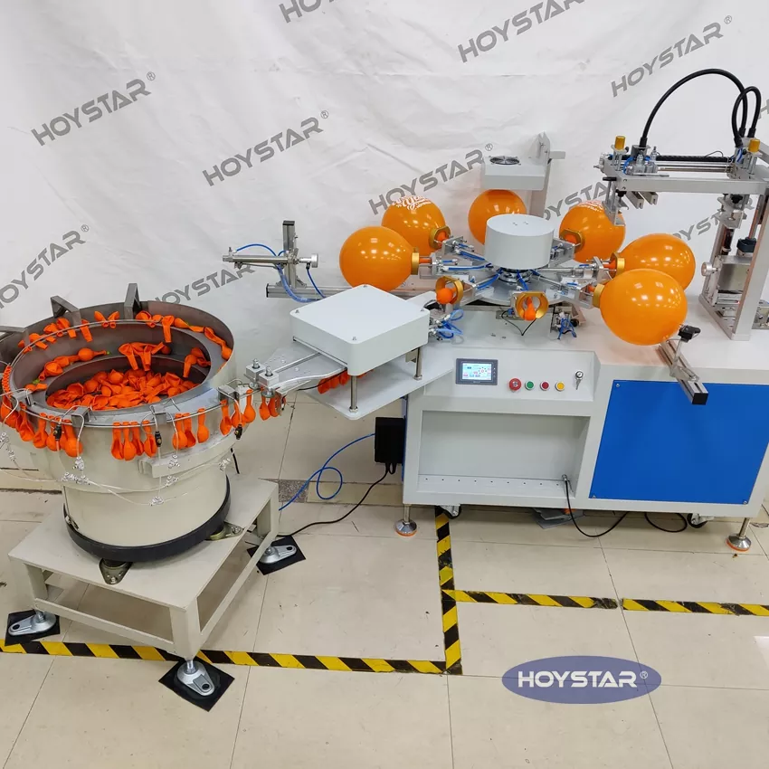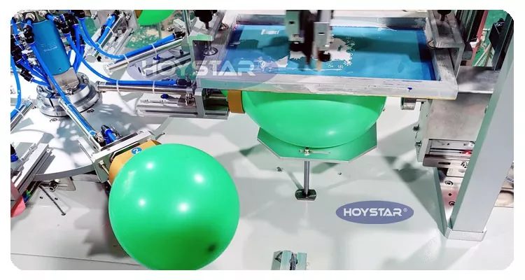 ในฐานะผู้ผลิตและจำหน่ายเครื่องพิมพ์หน้าจอลูกโป่งสีอัตโนมัติ HOYSTAR 1 สี ถูกออกแบบมาสำหรับการพิมพ์บนลูกโป่งลาเท็กซ์ พร้อมกับโต๊ะทำงานแบบหมุน, การโหลดอัตโนมัติ, การเป่าอัตโนมัติ, การหมุนอัตโนมัติ, การอบแห้งอัตโนมัติ, ฟังก์ชั่นการขนถ่ายอัตโนมัติ การควบคุมหน้าจอสัมผัส PLC ส่วนต่อประสานที่ใช้งานง่ายเพื่อความปลอดภัยและการใช้งานที่ง่ายดาย ตัวเครื่องผสมผสานความเร็ว ความแม่นยำ และความสะดวกในการใช้งานเข้าด้วยกัน